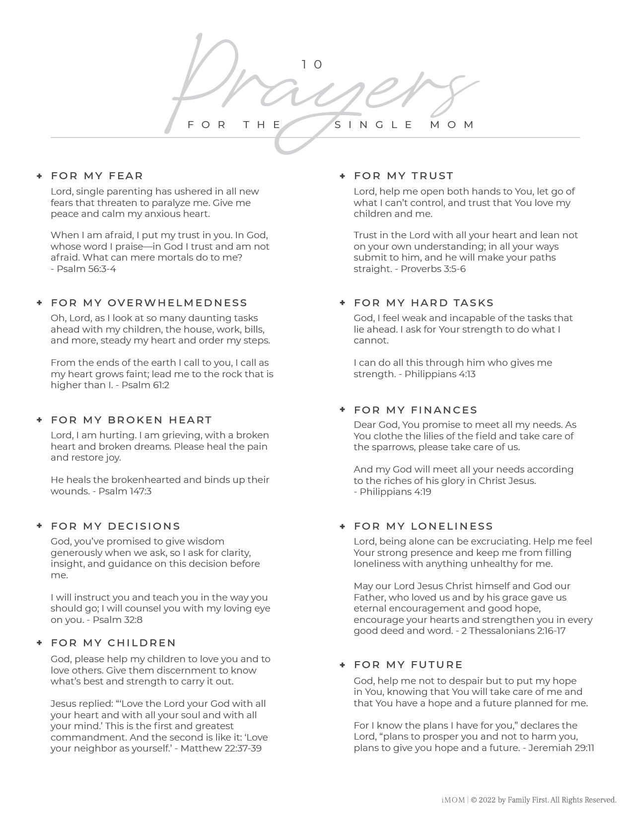 But I also know prayer. Prayer has been a lifeline for me these last eight years. It’s been a continuous conversation between me and God every time I feel incapable or lonely or overwhelmed. God has a heart for single moms and He hears our prayers. We’ve created a free printable for you with 10 prayers for single moms. Print 10 Prayers for the Single Mom to hang on your mirror, slip into your Bible, or give to a single mom friend.