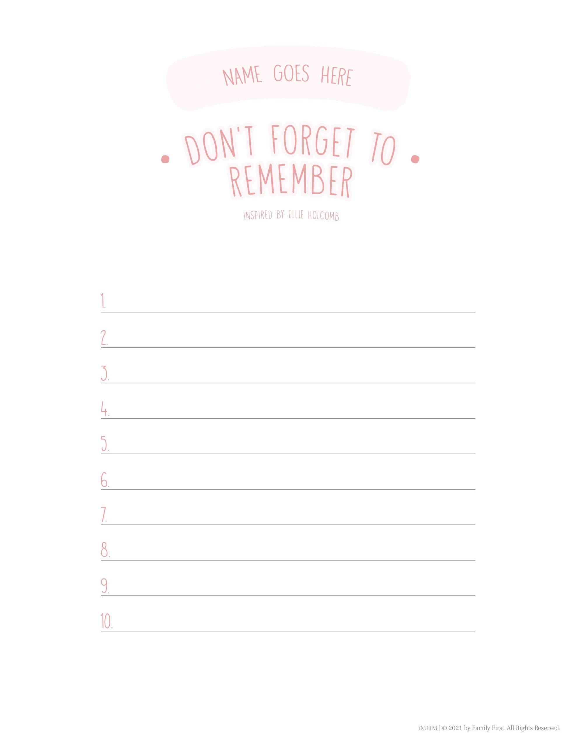 Every mom wants her children to hold on to the important lessons, so we’re making it a little easier with our Don’t Forget to Remember printable page. It’s inspired by the children’s song and book of the same name by one of our favorite mom friends, Ellie Holcomb. Just put your child’s name at the top and fill in what you want your children to always remember (or use our ideas). Frame the list and put it in your child’s bedroom, send it to your college student in a care package, or seal it in an envelope and give it as a gift on a special birthday. It’s a great way to remind your children of the most important thing—that you’ll always love them!