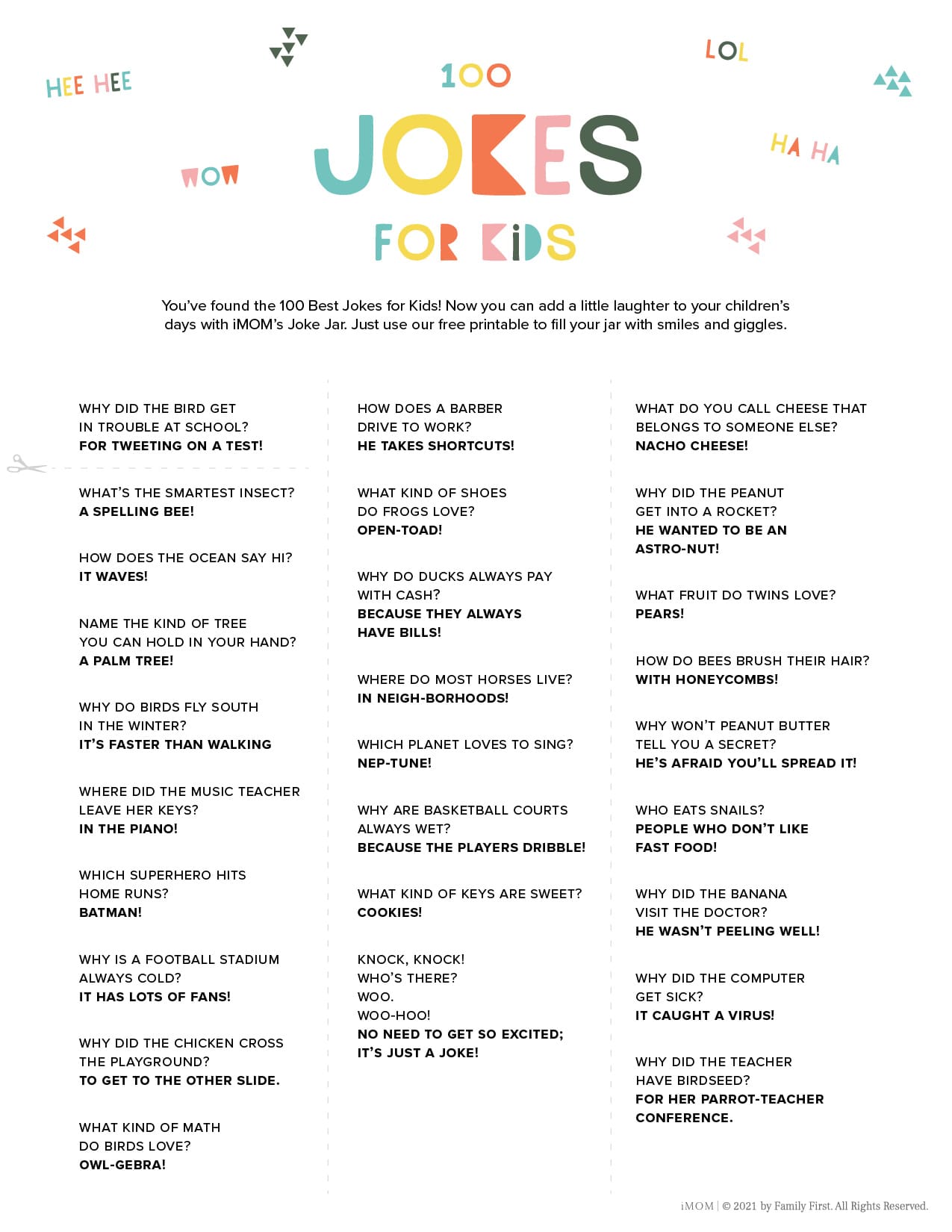 Thanks to iMOM’s team of stand-up comics, the jokes for kids aren’t running out any time soon (you’re welcome)! Your kids can put on a stand-up routine at each holiday, master the art of the knock-knock, and have everyone scratching their heads at ridiculous riddles. You can even create a joke jar with the printable. Cut out the jokes and when your family needs a zinger, just pull one from the jar. And hey, you never know. You might even find yourself in a full-on belly laugh, so pull up a chair and let the jokes begin!