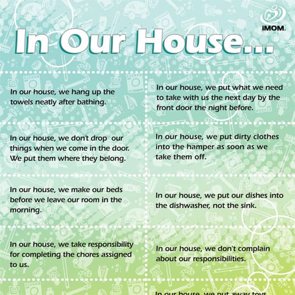 Having an HE – high efficiency – home starts with having a household cleaning schedule. iMOM’s HE home printable gives you an easy to follow schedule so you can have an easy to clean home! I don’t know about you, but it’s hard for me to have a clear mind when my house is a mess and I feel disorganized. You know what I mean, the kind of mess and disorganization that becomes a pattern and seems to hang around day after day. The best way to have a clear house and a clear mind is to get your family involved on a regular basis, and to use a daily to-do list yourself.