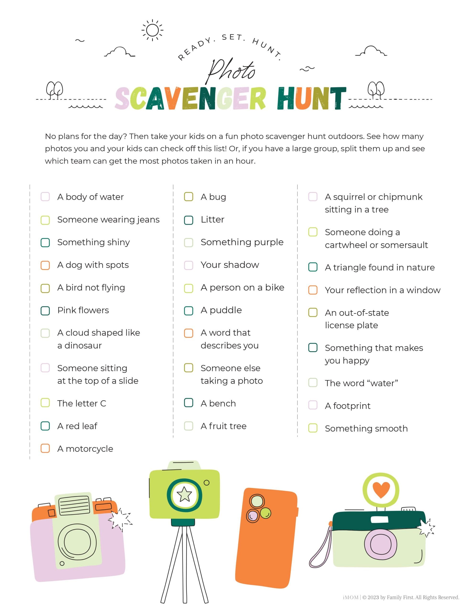 The idea is to get kids moving and talking! Check out iMOM’s other scavenger hunts as well for fun in nature, in the city and more!