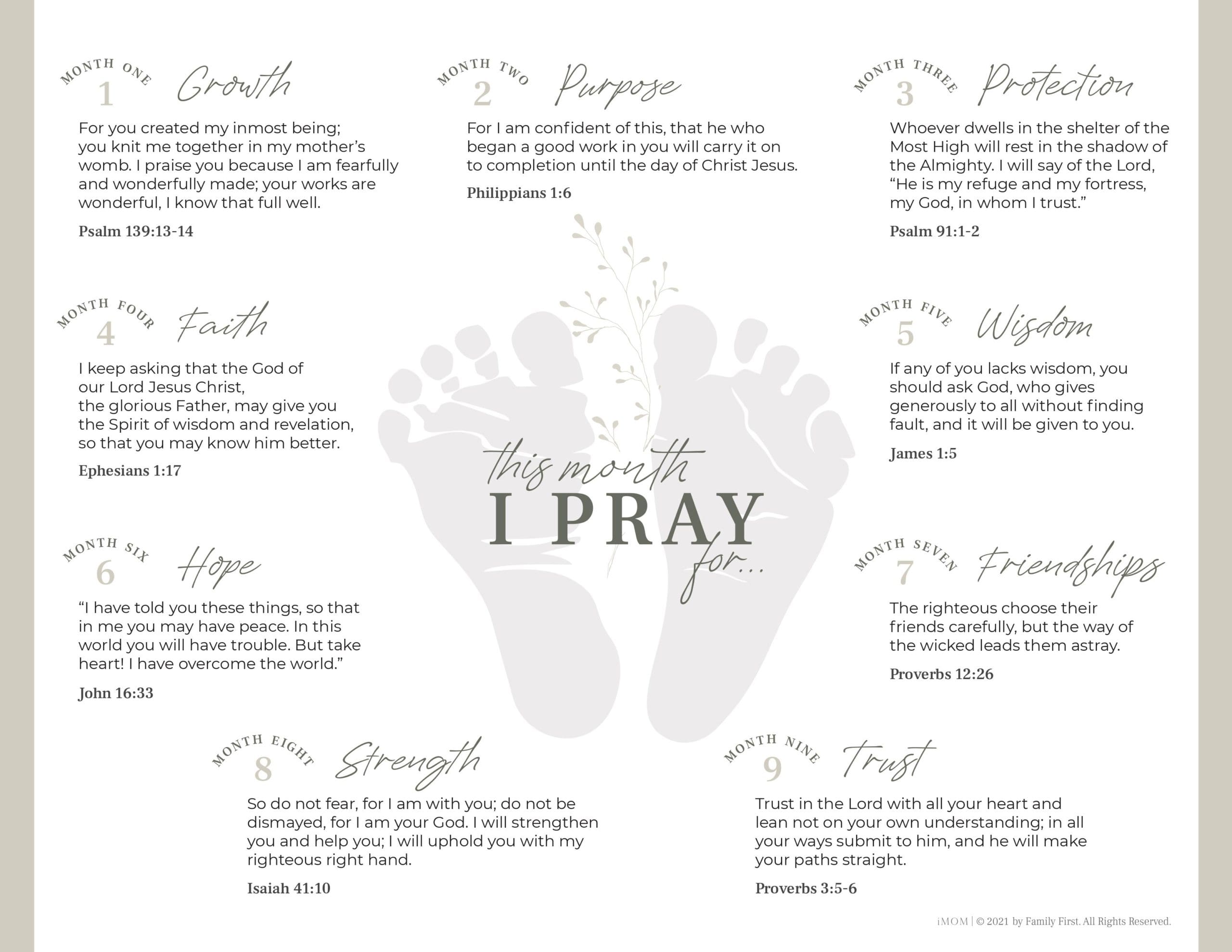 Each month as you think about the word or characteristics, use the accompanying scripture to remind yourself of God’s promises and faithfulness. Because we know every family is different, we’ve also created a blank version. Your prayer for your unborn baby is uniquely yours, so pick your own words and make your own beautiful design.
