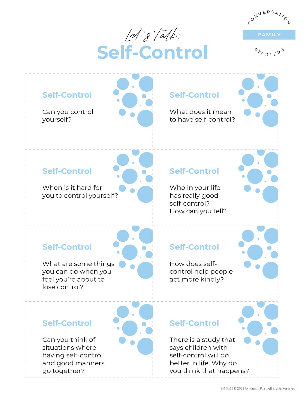 What is the difference between self-control and self-discipline? Self-control helps you to not do what you shouldn’t. Self-discipline helps you to do what you should. Here are Self-Control Conversation Starters for Kids to help you teach your child the concept of self-control.