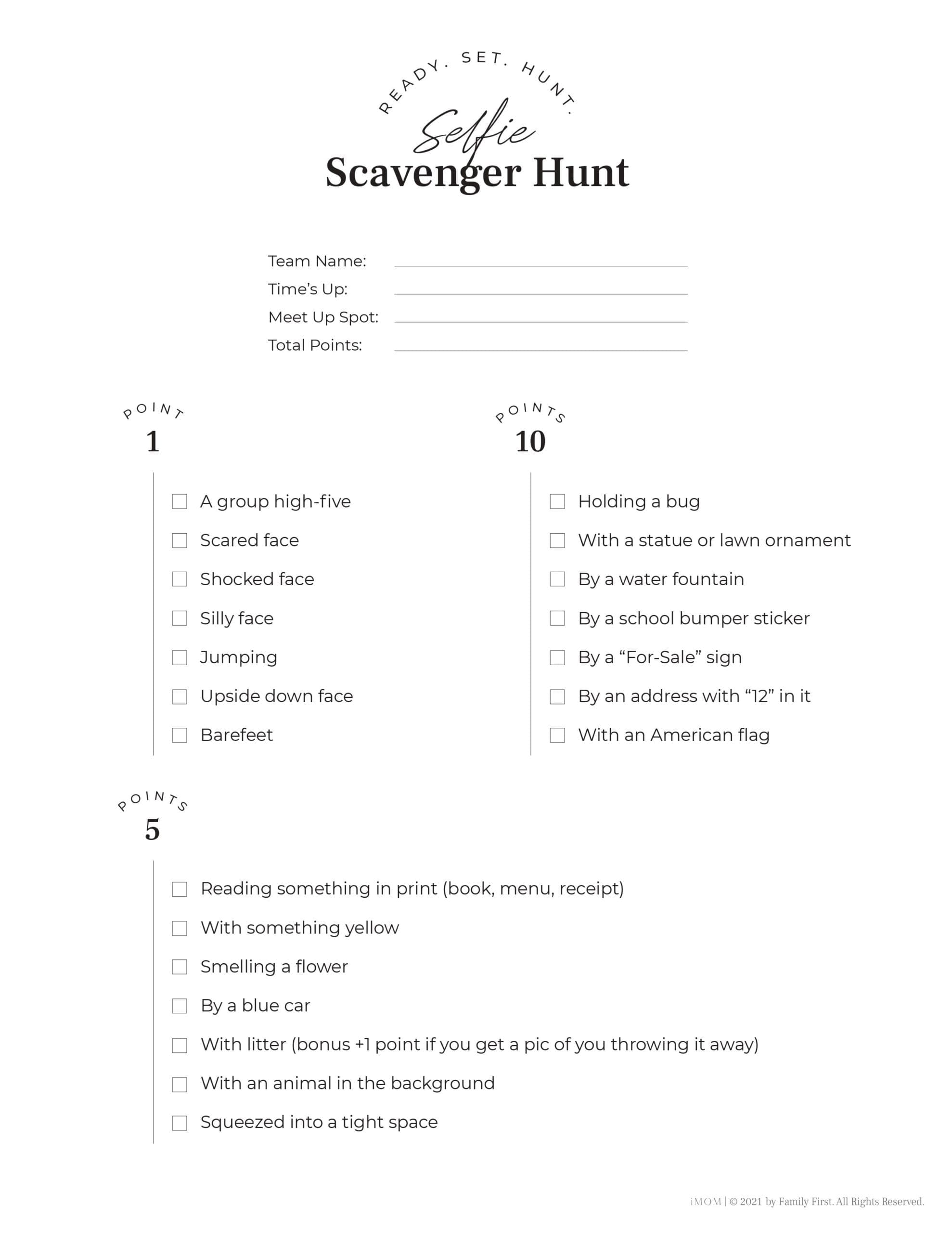 Don’t be afraid to think outside the box. There are no points for creativity, but it could help you score just one more photo. So print a few copies, plan your route, and start the selfie fun.