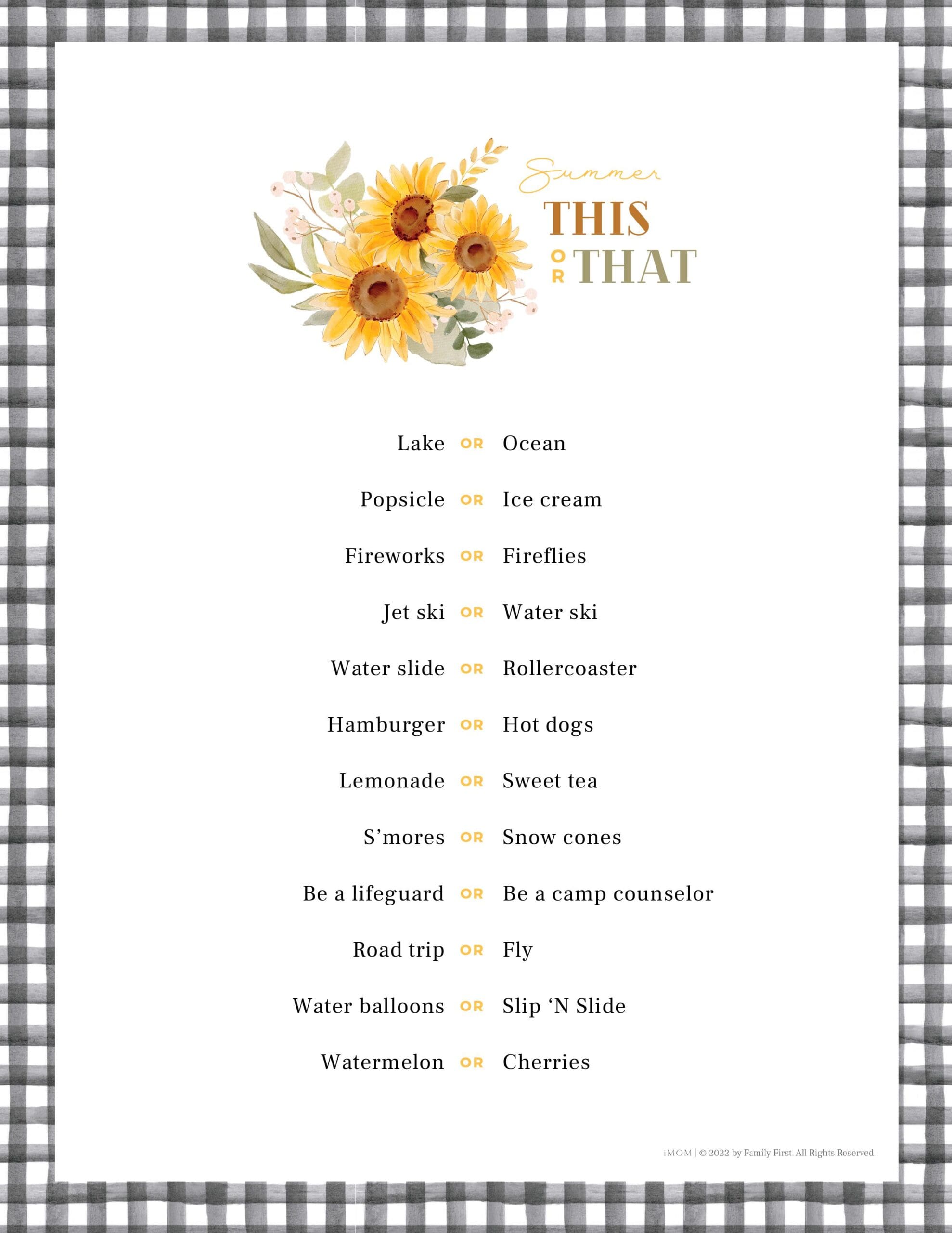 Not only do kids really get excited about answering Summer This or That questions, but they can also fill the educational void in the summer—really! Not that you want your kids to know that you’re going educational on them, but my teacher brain loves some of the hidden benefits of This or That questions. They help with critical thinking skills, develop visual imagery abilities, and help children learn to compare and contrast. So bring on the This or That!