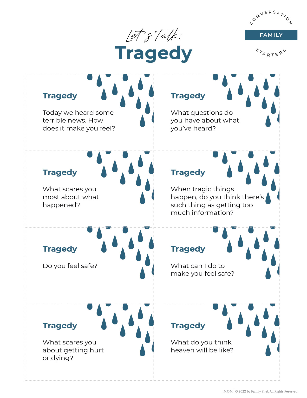 When bad things happen, we want our children to know they can turn to us for support and comfort. These conversation starters will help your children articulate their fears and concerns, so that you can comfort and reassure them.