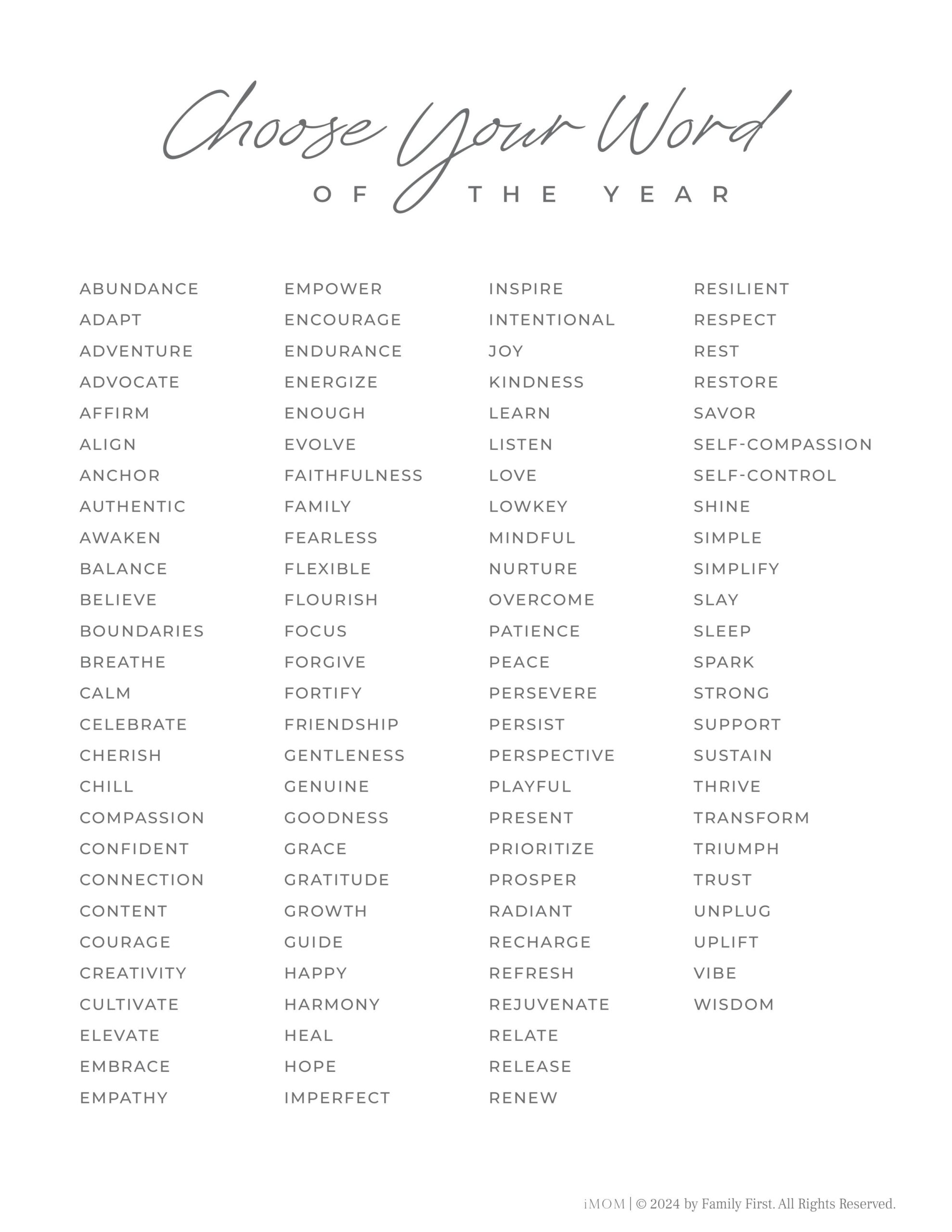 Our free printable offers 105 powerful words handpicked by our team of moms. These word-of-the-year ideas work for parenting, marriages, personal growth, and careers. Choose one that inspires you to be the best version of yourself and let it guide your intentions for the next 12 months.